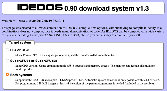 Go to the IDEDOS Download System webpage. There are several sections, each section provides options for compatibility with the IDE64 hardware that will be emulated by VICE.