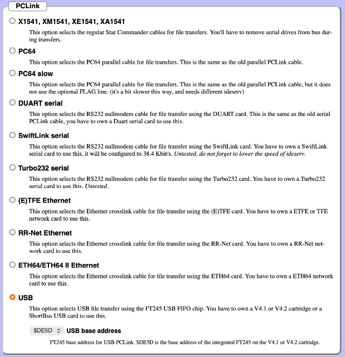 PCLink on original hardware is able to function over a large number of physical connections. For use in VICE, choose the USB option. Keep the the default USB base address of $DE5D.