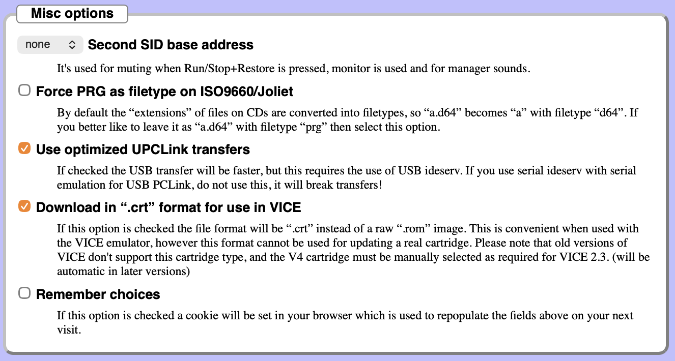 Since these instructions are for emulated IDE64 hardware, be sure to check (i.e., select) the option to download as a .CRT file for VICE. Also, since we have selected to use PCLink over USB, check on the option to use optimized UPCLink transfers.