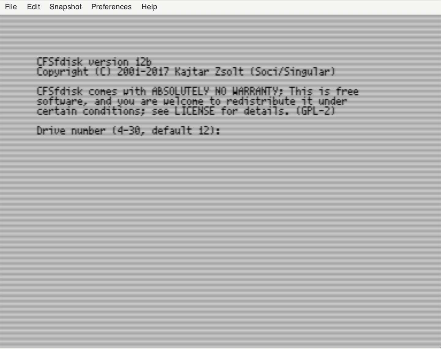CFSfdisk starts by asking you for the IDE64's "drive number", this is the C64 device number. We have previously configured the virtual IDE64 to device 12, which is how the primary device number is typically configured on physical IDE64 hardware. Press RETURN to accept the default of 12, and proceed.