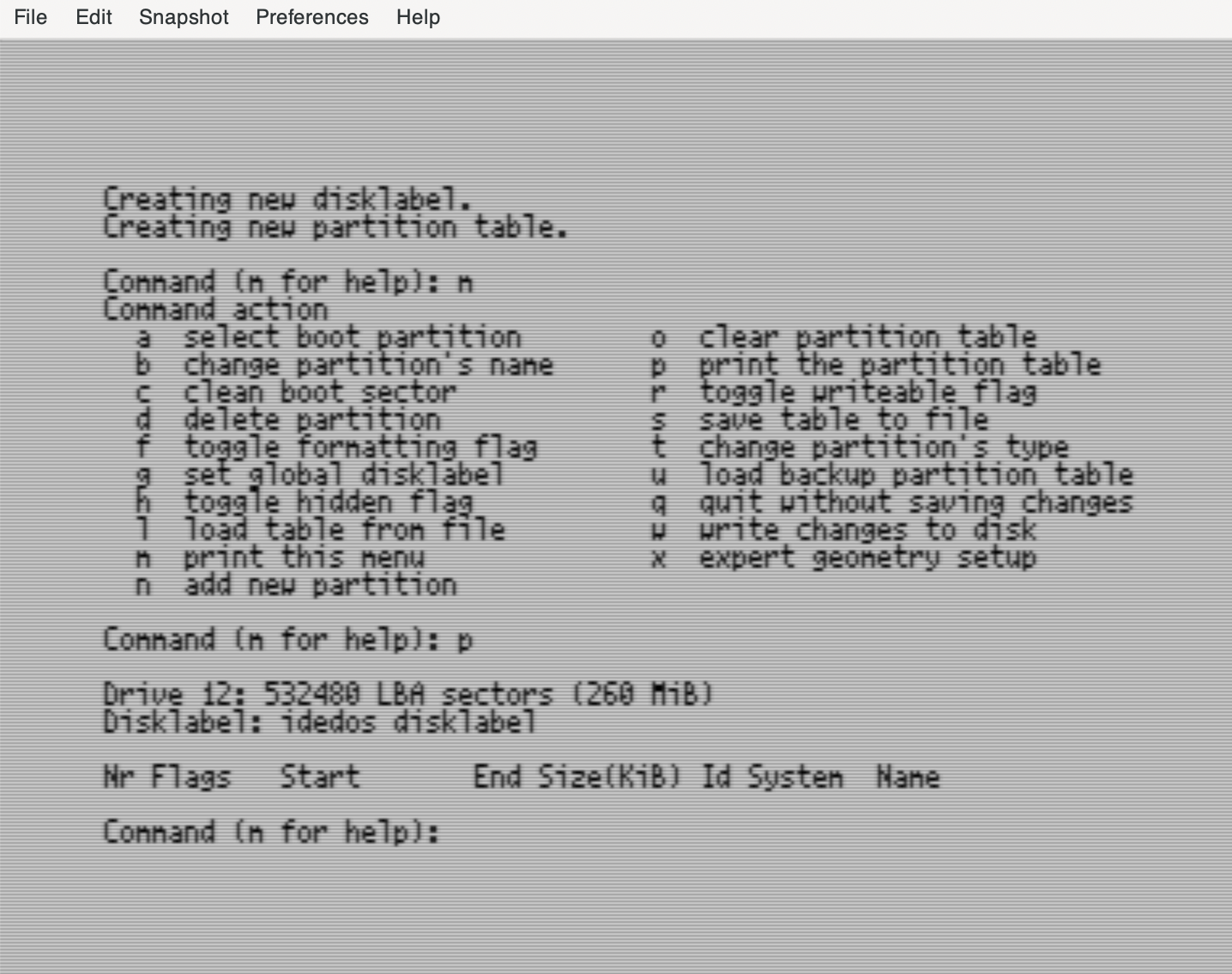 The IDEDOS which runs on IDE64 uses its own native file system called CFS. Because we have just created a blank IDE64 disk image, it is necessary to first create one or more partitions on the image.