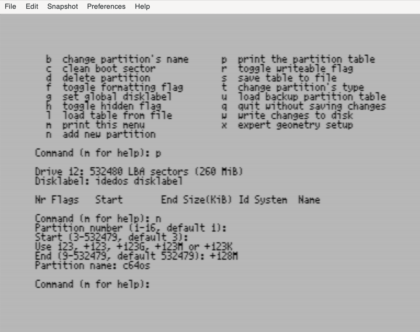 Finally it asks for the new partition's name. This name appears in the partition directory. The recommended C64 OS configuration is for partition 1 to be called "c64os" (or something similarly identifying it as the C64 OS system partition). Press deleted to remove the default name, and replace it by typing "c64os" and press RETURN.