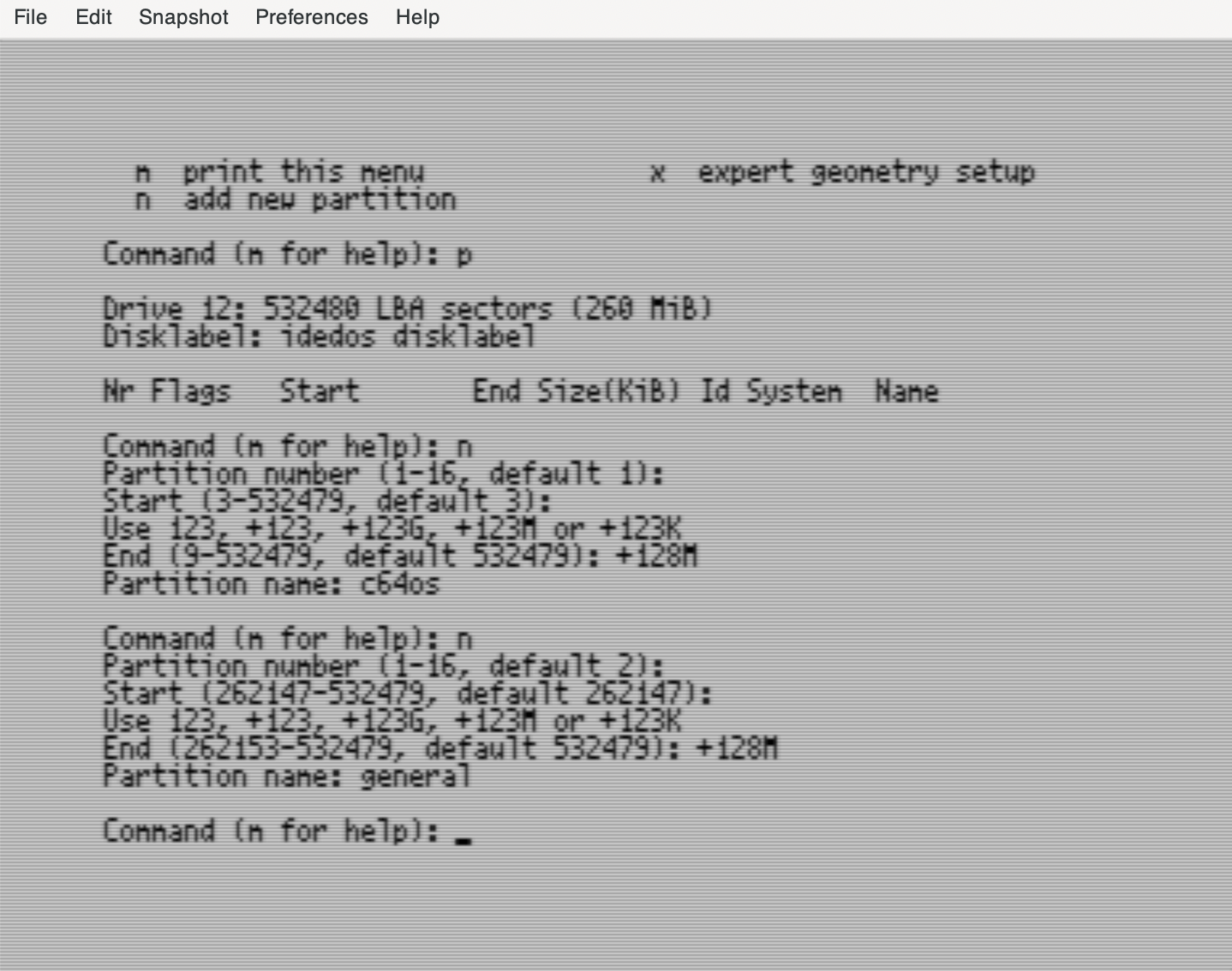 Next it asks you how much space this partition should use. There are multiple ways to express the space it should use. The recommended C64 OS configuration is a minimum of 2 partitions. Earlier we configured the disk image to have space for two 128MB partitions. The size for the first partition can be expressed by entering +128M and pressing RETURN.