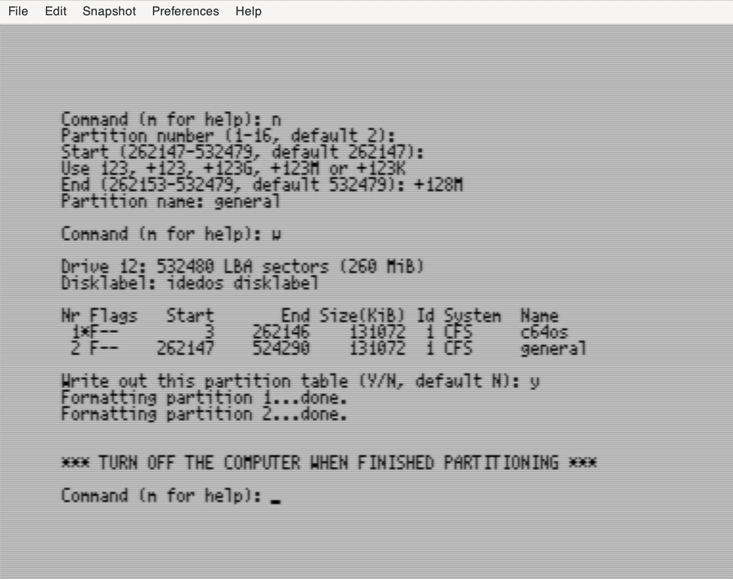 Changes made to the partition table have not yet been committed to the virtual medium. To make the partition table changes permanent use the "w" command, write changes to disk. Confirm that you really want to make these changes by typing "y" and pressing RETURN. When the partitions have been created you are instructed to power off the computer.