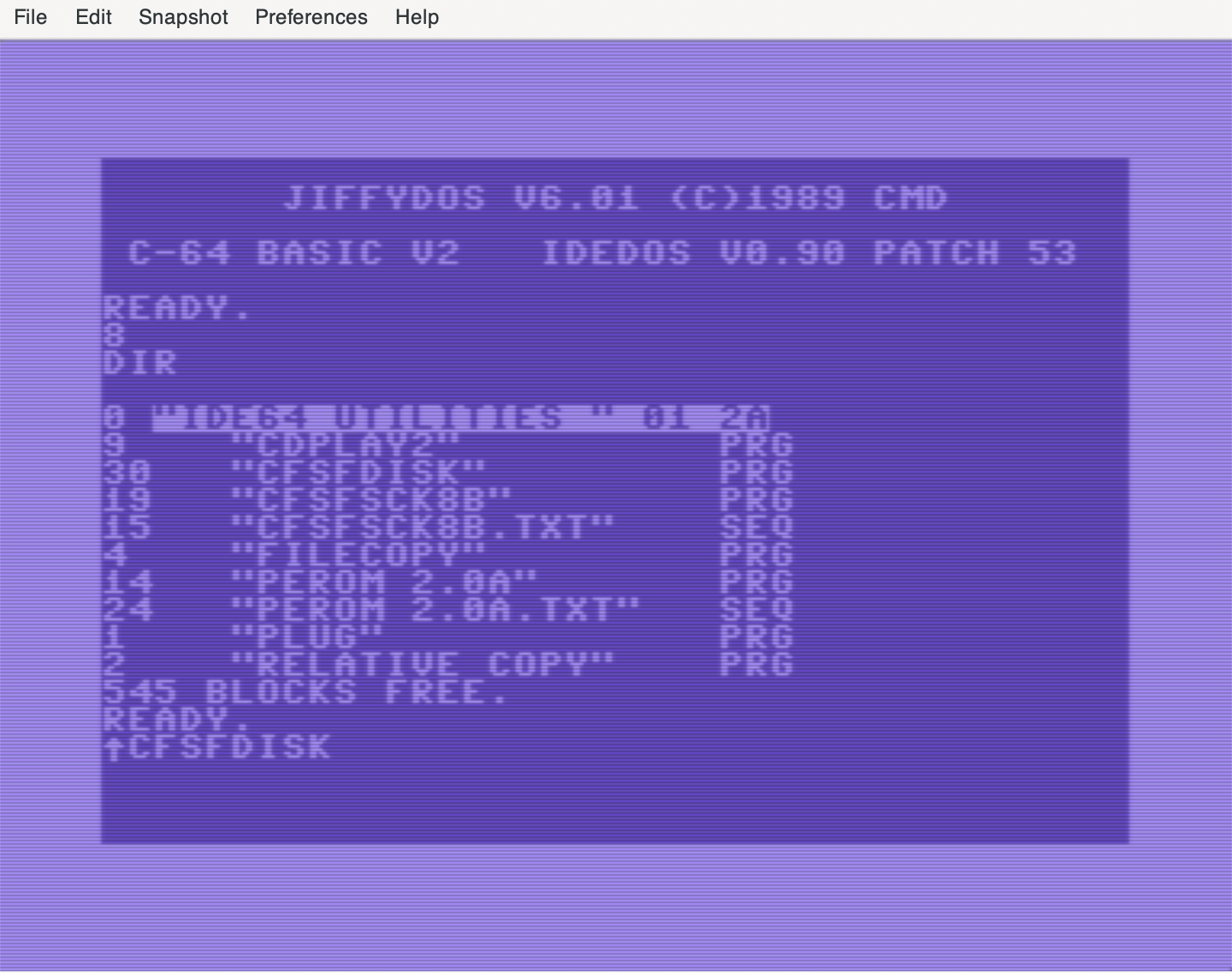 This should list the IDE64's partition directory, and you should see the two partitions. More advanced options for partitioning the IDE64 and configuring special flags and options can be found in the IDE64 User's Guide.
