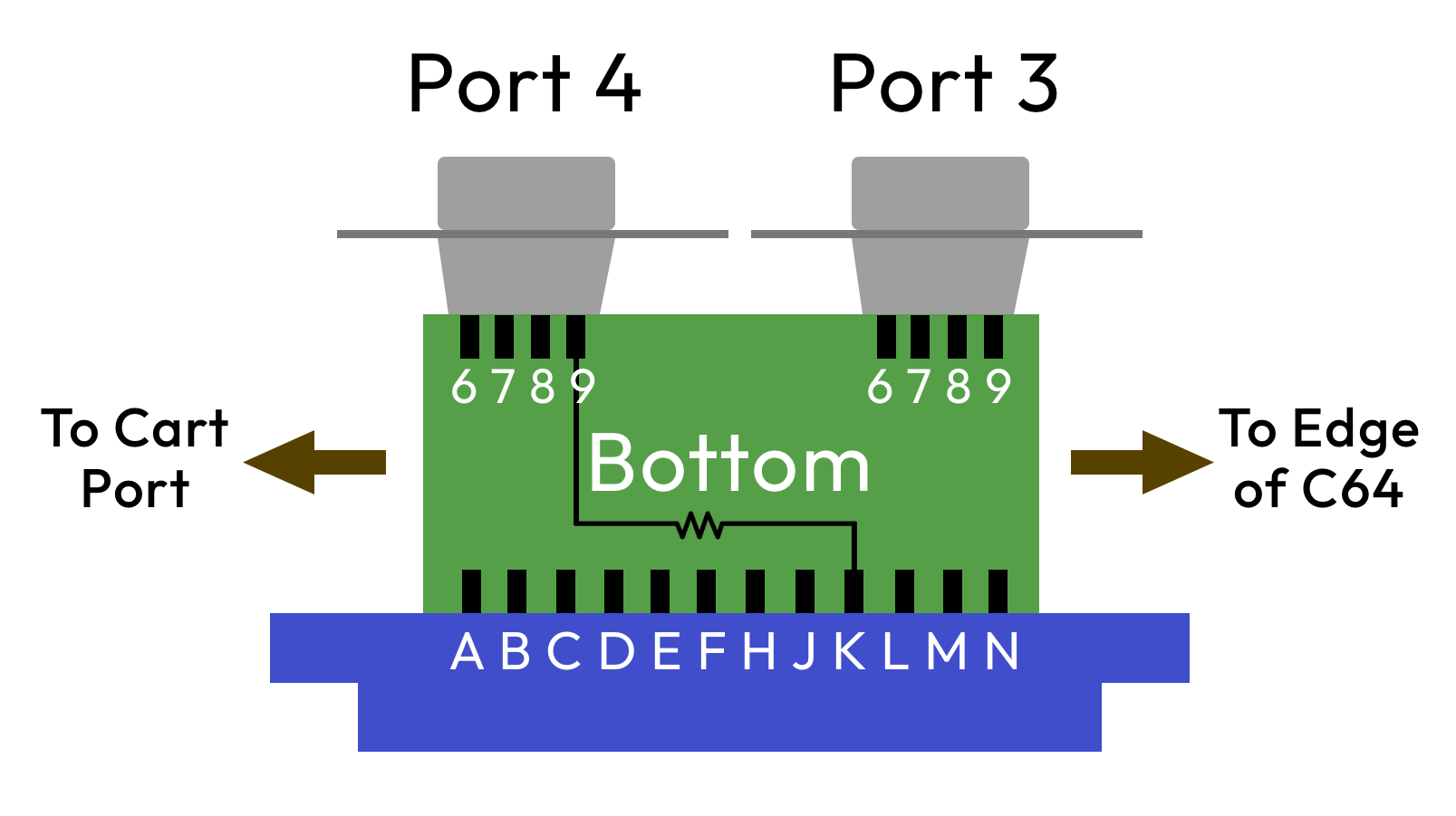 There is some general confusion over which of the two ports ought to be called port 3 and which ought to be port 4. On the side of the C64 the one closest to the front is clearly labeled port 1, and the one closer to the power switch is port 2. In my C64 Luggable project I have a 4-player adapter and all 4 controller ports are mounted on the front plate. Obviously I want these to be in order, left to right, ports 1, 2, 3 and 4.