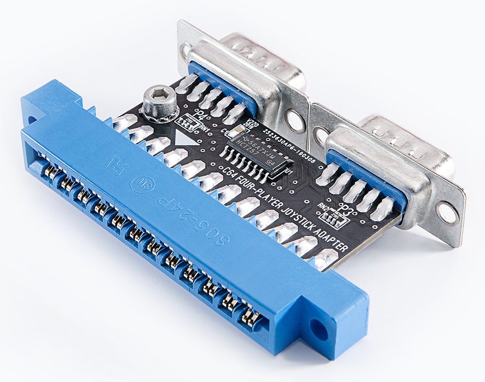 As it turns out, there already exists a rather popular adapter for plugging joysticks into the User Port. It's the 4-player adapter. There are at least two kinds of 4-player adapter for the C64, but by far the most popular is the one called "CGA" for Classic Games Adapter. This one is sold by Individual Computers, and it is also carried by Protovision. And you can usually find them on eBay by searching for "4-player adapter C64". In the rest of this post, we are discussing the CGA-type 4-player adapter, but just be aware that there is another kind, which I haven't looked into.