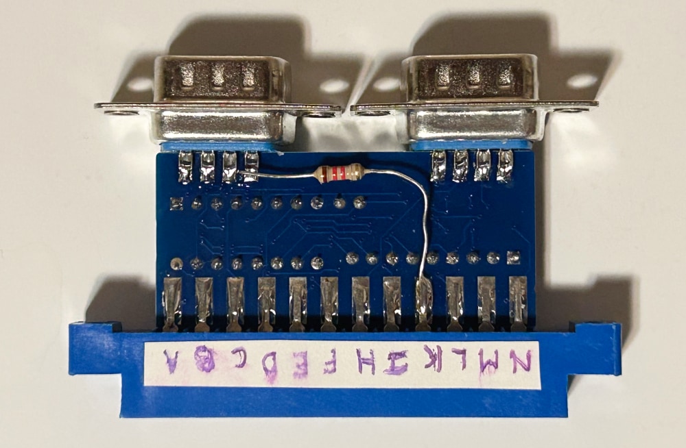 Conveniently, these are both on the bottom, so the resistor doesn't have to wrap around the PCB and it's neatly hidden when the adapter is plugged in. When looking at the bottom, port 4 is on the left, pin 9 is the rightmost of its four pins. And pin K on the User Port is 4th from the right. In our experiments, I've been working with Jim Cannell from the UK (who also generously donated me a NEOS mouse for testing.) If the resistance is too high, the CIA doesn't detect button changes; if it's too low, it risks damaging the CIA. A resistance of around 1.2 kΩ seems to be a sweet spot. (Disclaimer: I'm not an electrical engineer, and I cannot guarantee that this won't damage your CIA chip. Only perform this modification if you are comfortable doing so, knowing the risks.)