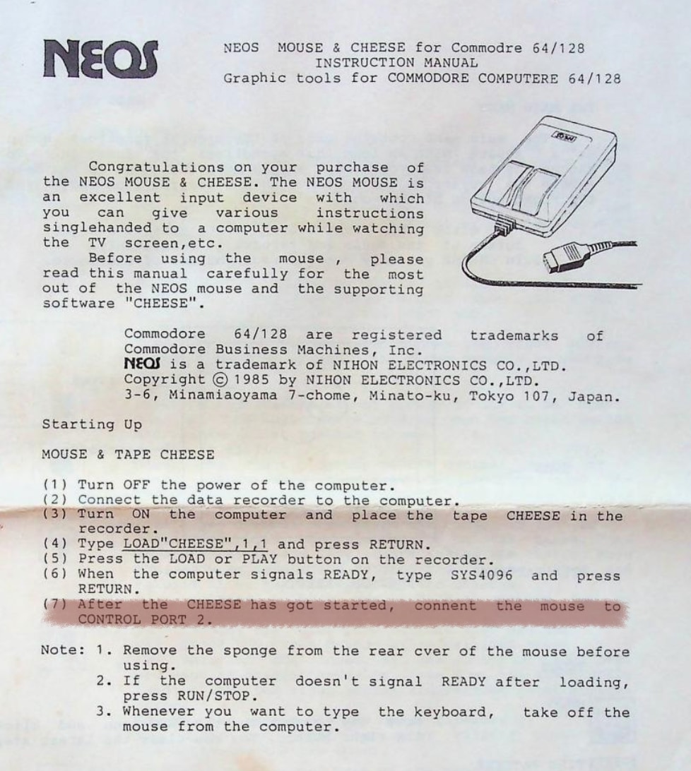 It says very clearly: With the computer off, hook up your cassette recorder. Power on the computer, load the CHEESE software off the tape and run it with a SYS command. Then, only after CHEESE is up and running, plug the NEOS mouse into port 2. Plug it in live while the computer is powered on. This is actually not recommended. It's probably fine, but that port was not designed to be hot-pluggable.