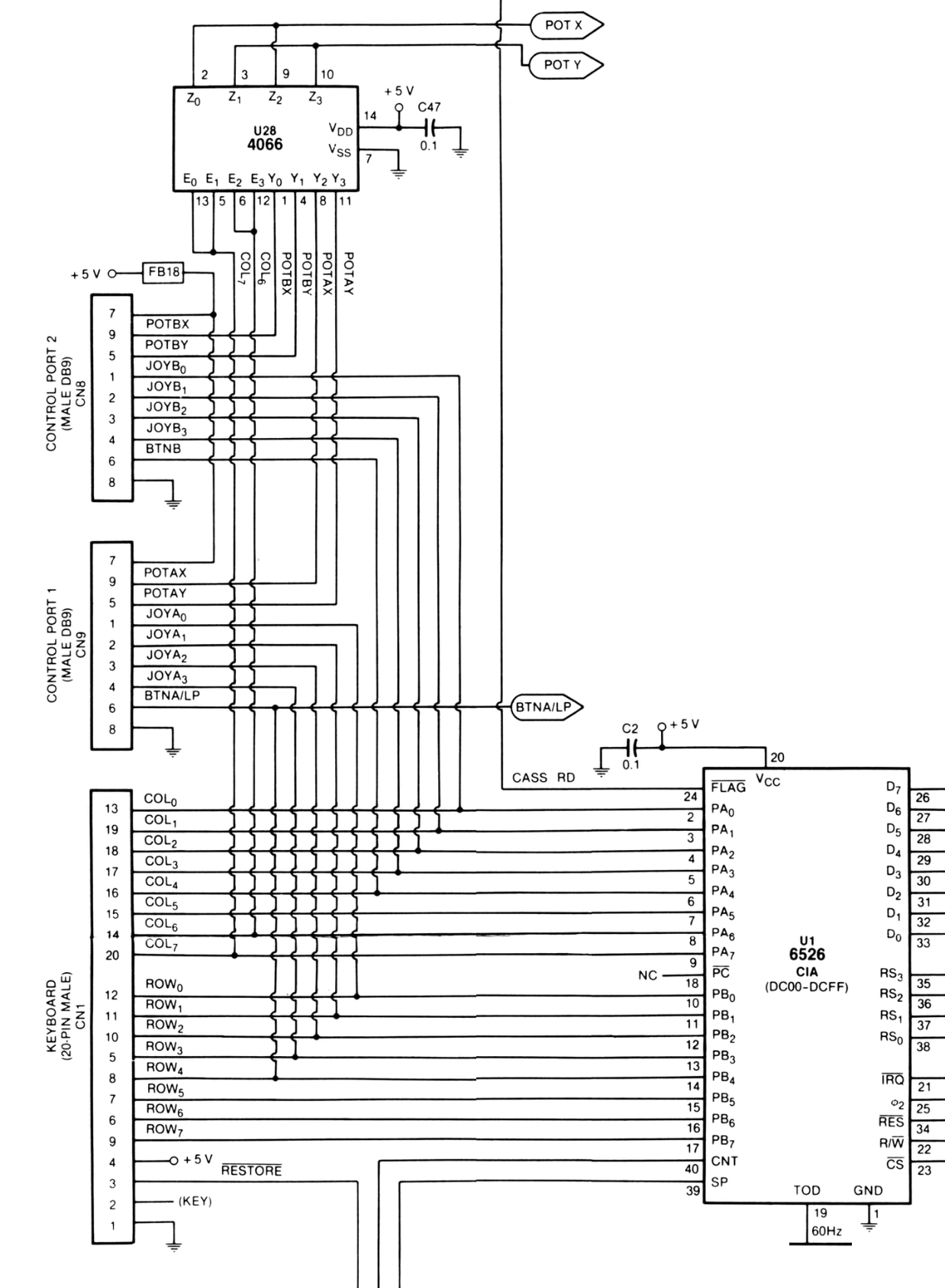 What we notice though is that all the bits of the CIA's two ports are occupied just with the keyboard, so how does it also manage to scan the joysticks? The controller ports have to make double use of the same CIA port lines that the keyboard uses. See the snippet of the C64 schematic below.