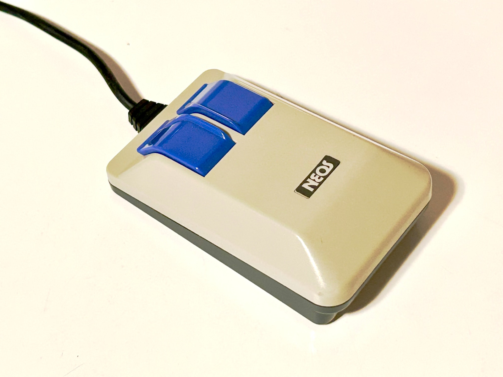 Here's what the NEOS mouse looks like. Its body shape is similar to the 1350/1351 or the original Amiga "tank" mouse. Its edges are a bit more rounded, the two buttons are blue instead of beige. They have little ridges on them and are slightly rounded at the front. To be perfectly honest, I find the NEOS mouse comfortable to hold. I don't think it looks bad at all and, its build quality actually feels much better than the Commodore 1351 mouse.