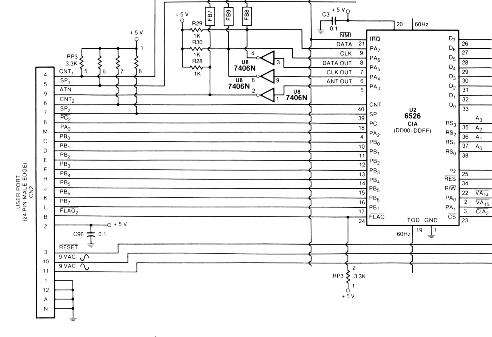 Above is the relevant snippet of the C64 schematic for the User Port. Again, details have been removed for clarity of focus.