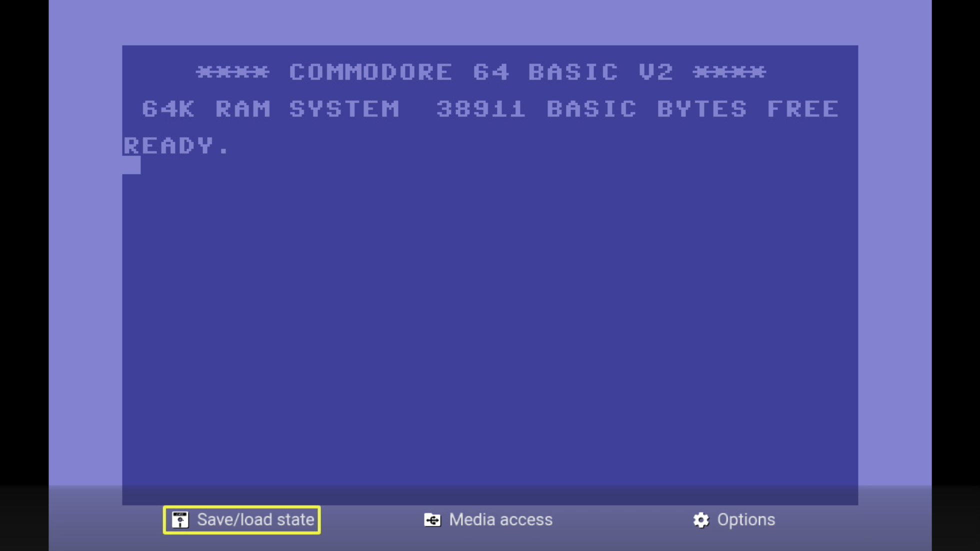 In classic mode you are presented with the standard Commodore 64 BASIC V2 and READY prompt. When you activate the menu system, a set of main menu options appears along the bottom, for saving snapshots, accessing USB media, and changing settings.